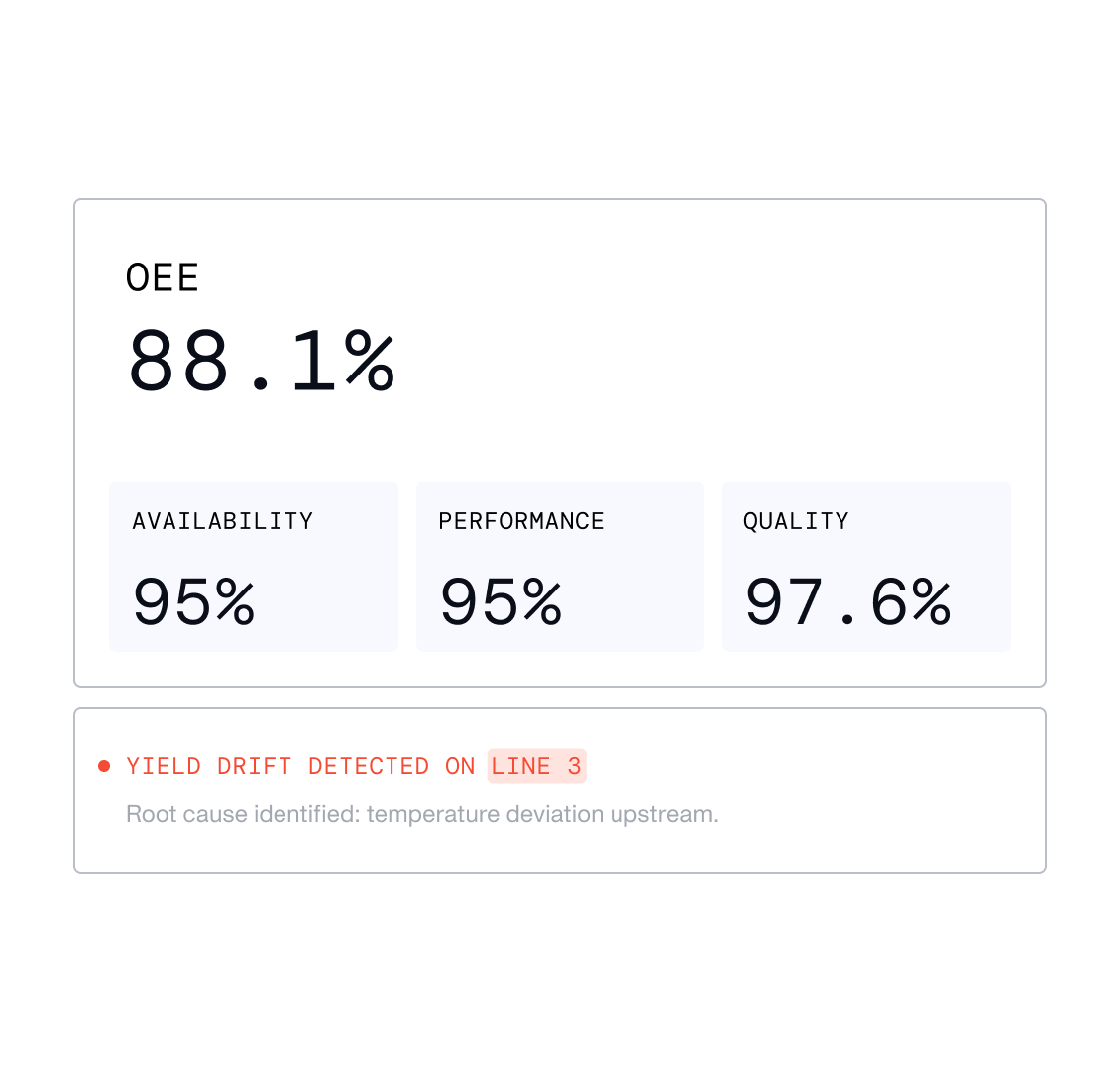 Agents continuously analyze production data, surface improvement potential, and control drifting processes to keep operations running at peak performance.