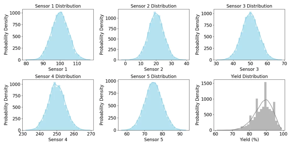 The below figure displays the distributions of the five sensor measurements and the production yield. Our goal is to identify sensor measurements that cause yield variation by utilizing the EthonAI Analyst software. The EthonAI Analyst employs causal algorithms to pinpoint the root causes behind production issues. Importantly, we approach this analysis as if the above ground-truth f