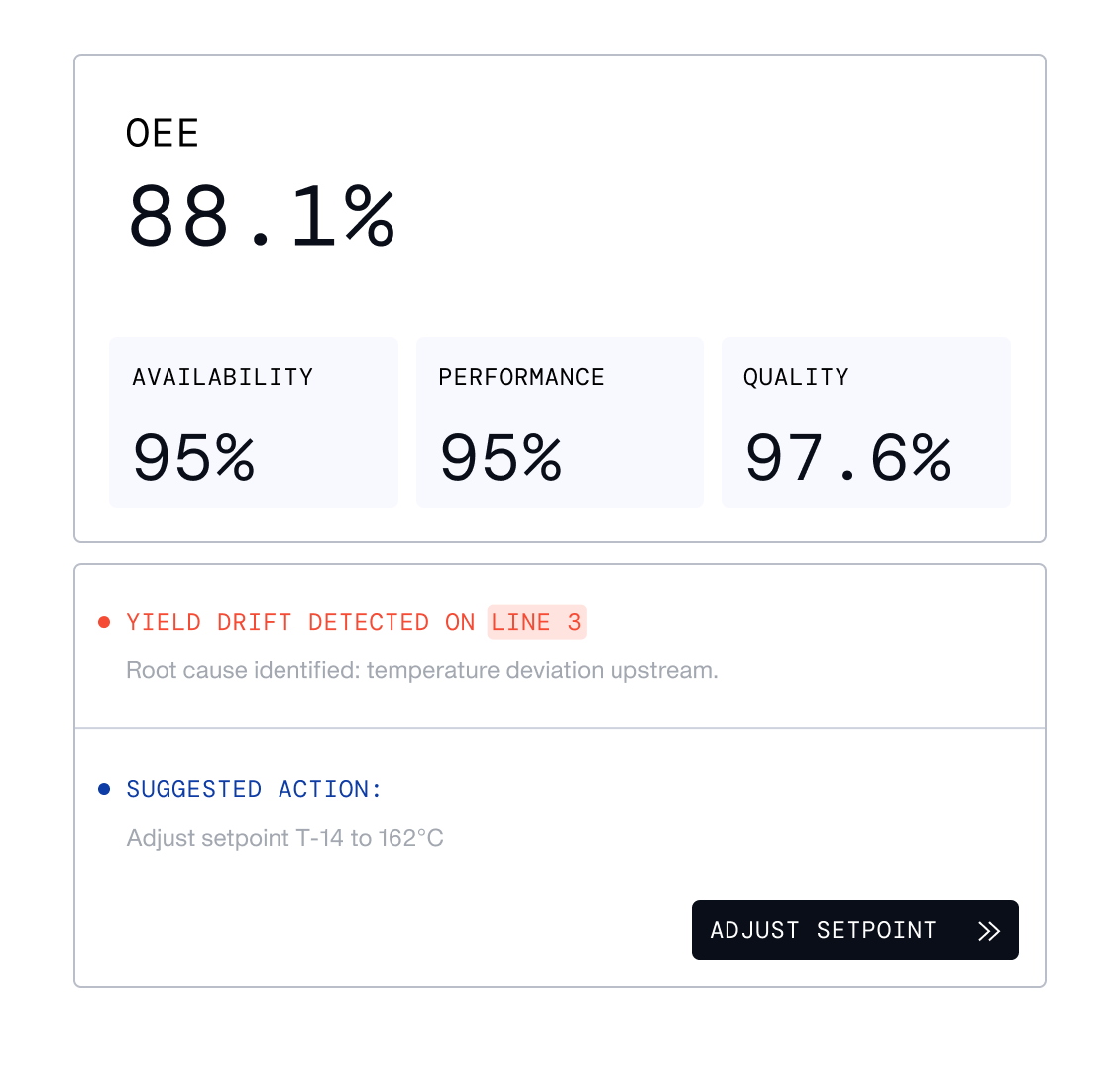 Agents continuously analyze production data, surface improvement potential, and control drifting processes to keep operations running at peak performance.